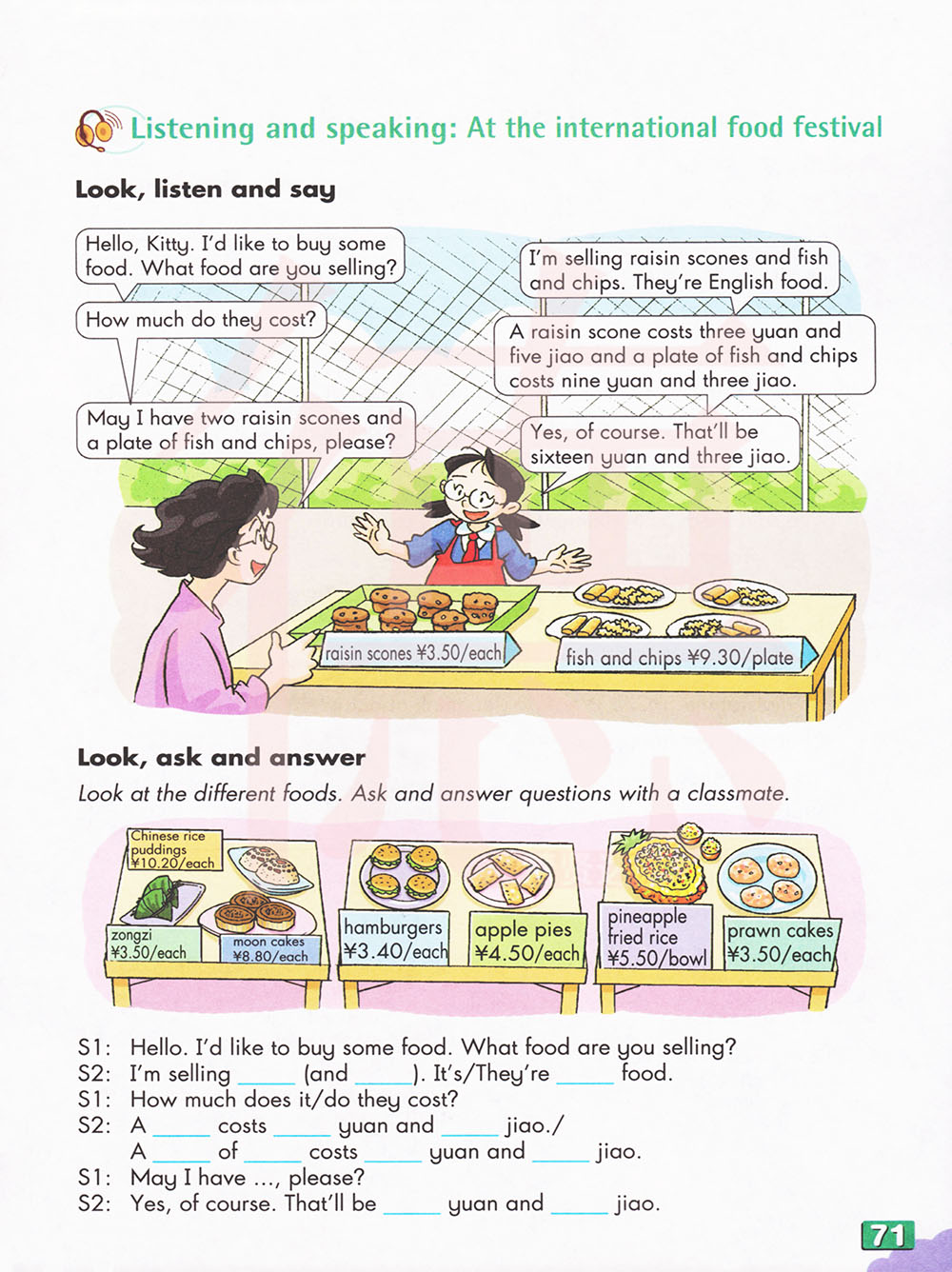 看看不同的食物。和同学们一起提问和回答问题。