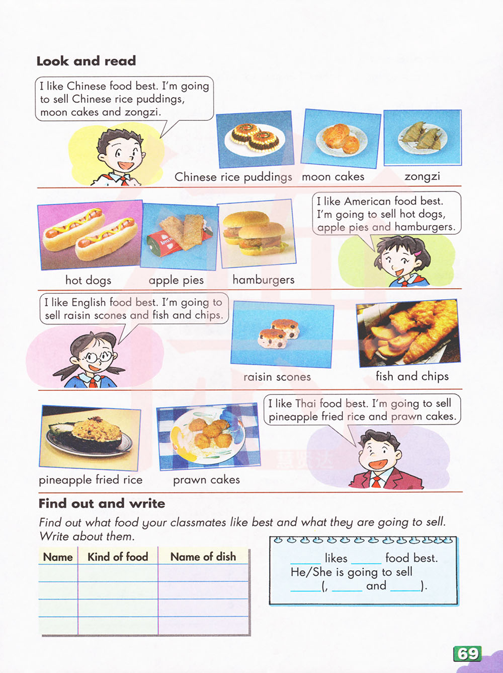 找出你的同学最喜欢的食物和他们打算卖的东西。写下来。