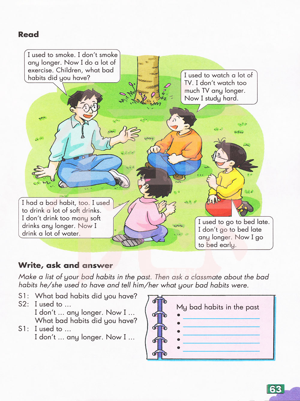 我以前抽烟。我不在抽烟了。现在我做很多运动。孩子们,你们有什么坏习惯?