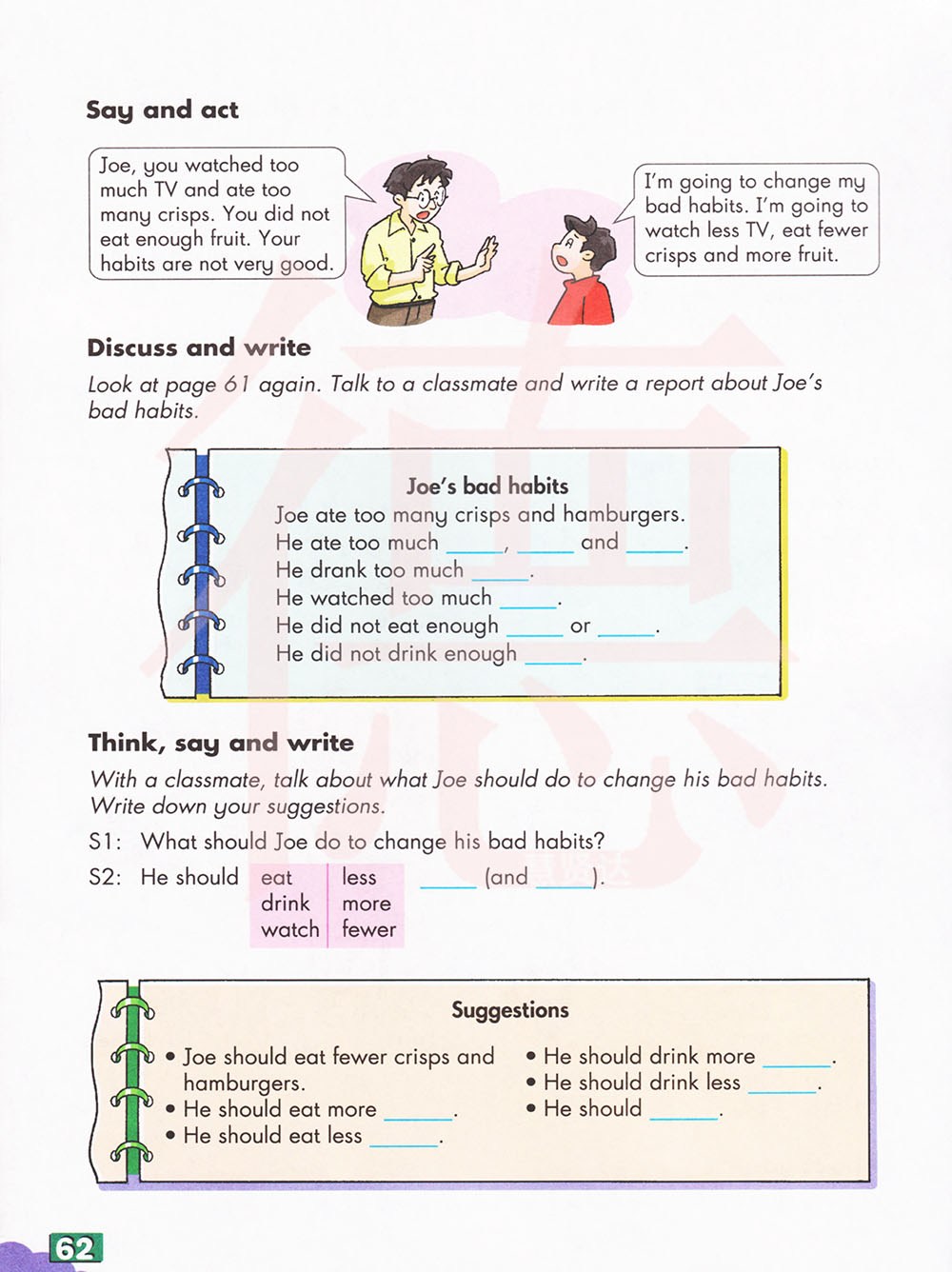 再看61页,和同学聊天,写一篇关于乔的坏习惯的报告。