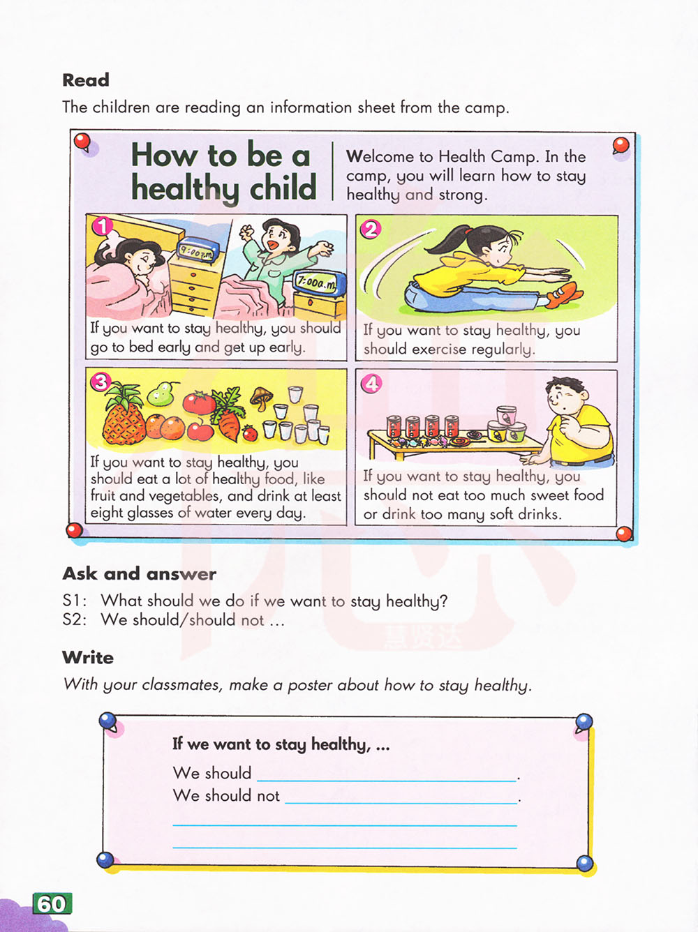 S1:如果我们想保持健康,我们应该做什么? S2:我们应该/不应该...