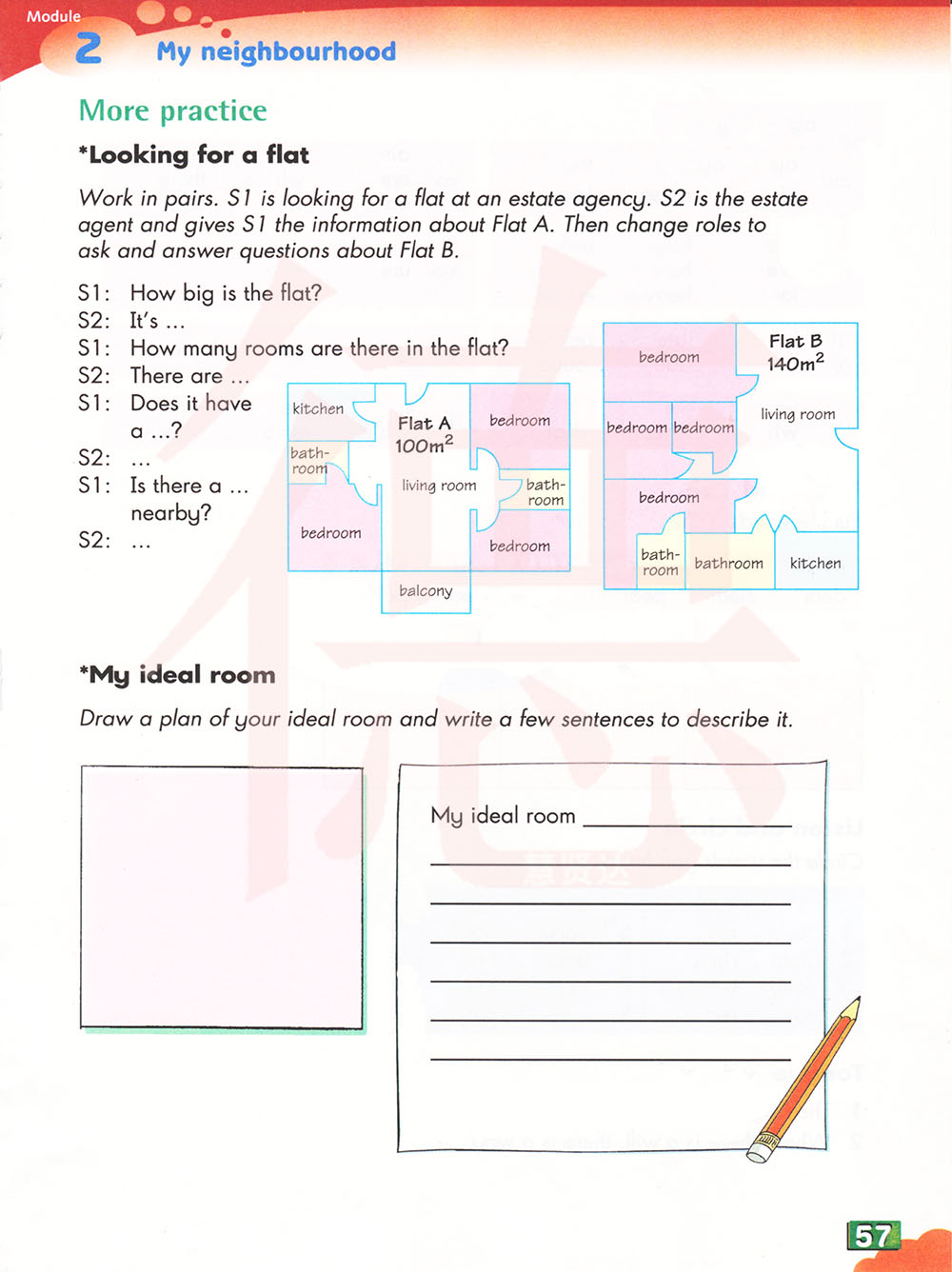 成对工作。S1正在一家房地产公司找一套公寓。S2是地产代理,向s1提供有关公寓a的信息。然后互换角色,询问和回答有关公寓b 的问题。