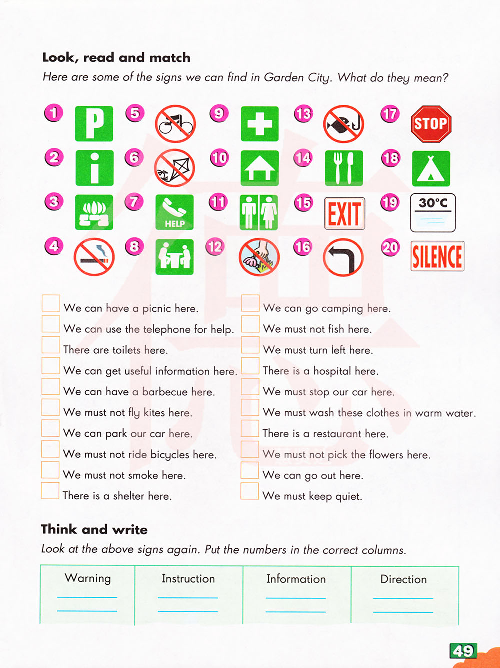 再看一下上面的标志。把数字填入正确的一栏。