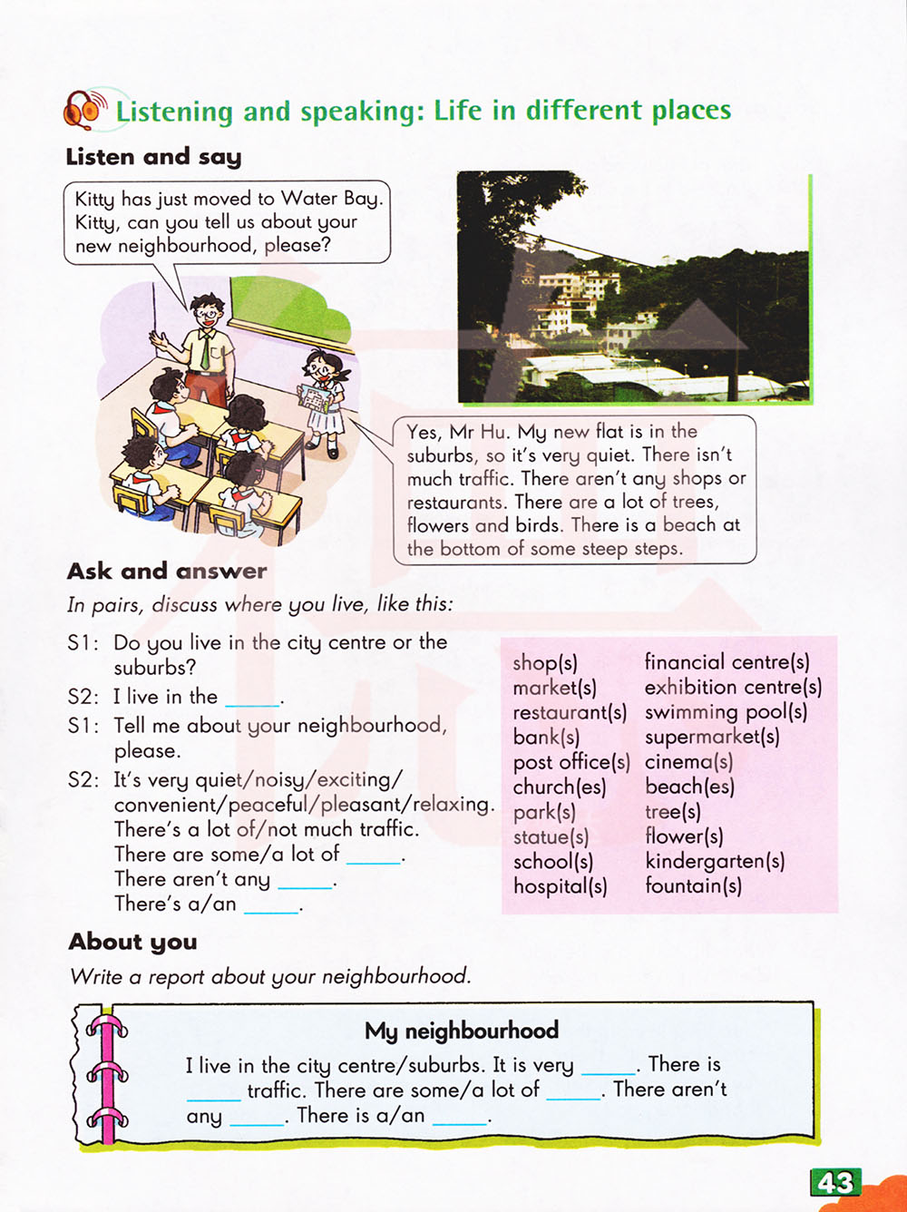 是的,胡老师。我的新公寓在郊区,所以很安静。那儿没有交通。没有任何商店和餐厅。有很多树,花和鸟,在一些陡峭的台阶的底部有一个海滩。