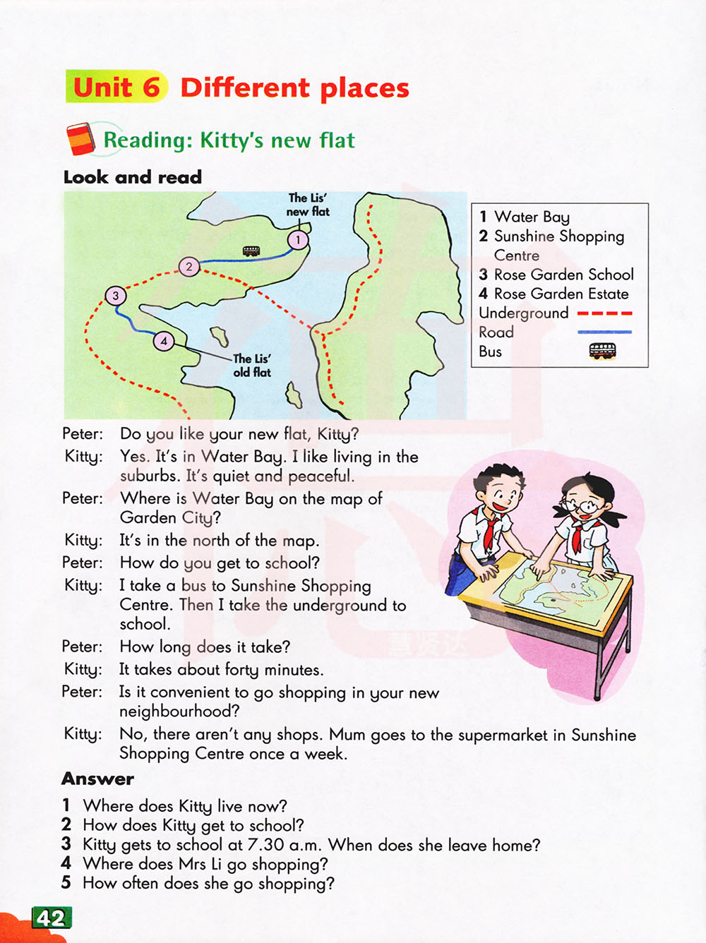 P:你怎样去学校? K:我乘公共汽车去阳光购物中心,然后乘地铁去学校。