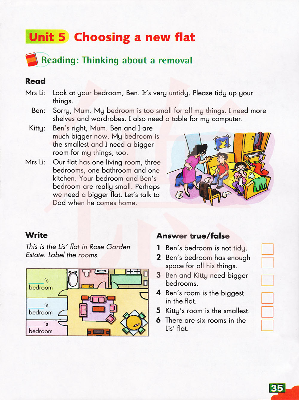 我们的公寓有一个客厅,三间卧室,一间浴室和一间厨房。你的卧室和本的卧室真的很小。也许我们需要一套更大的公寓。爸爸回家时我们和他谈谈。