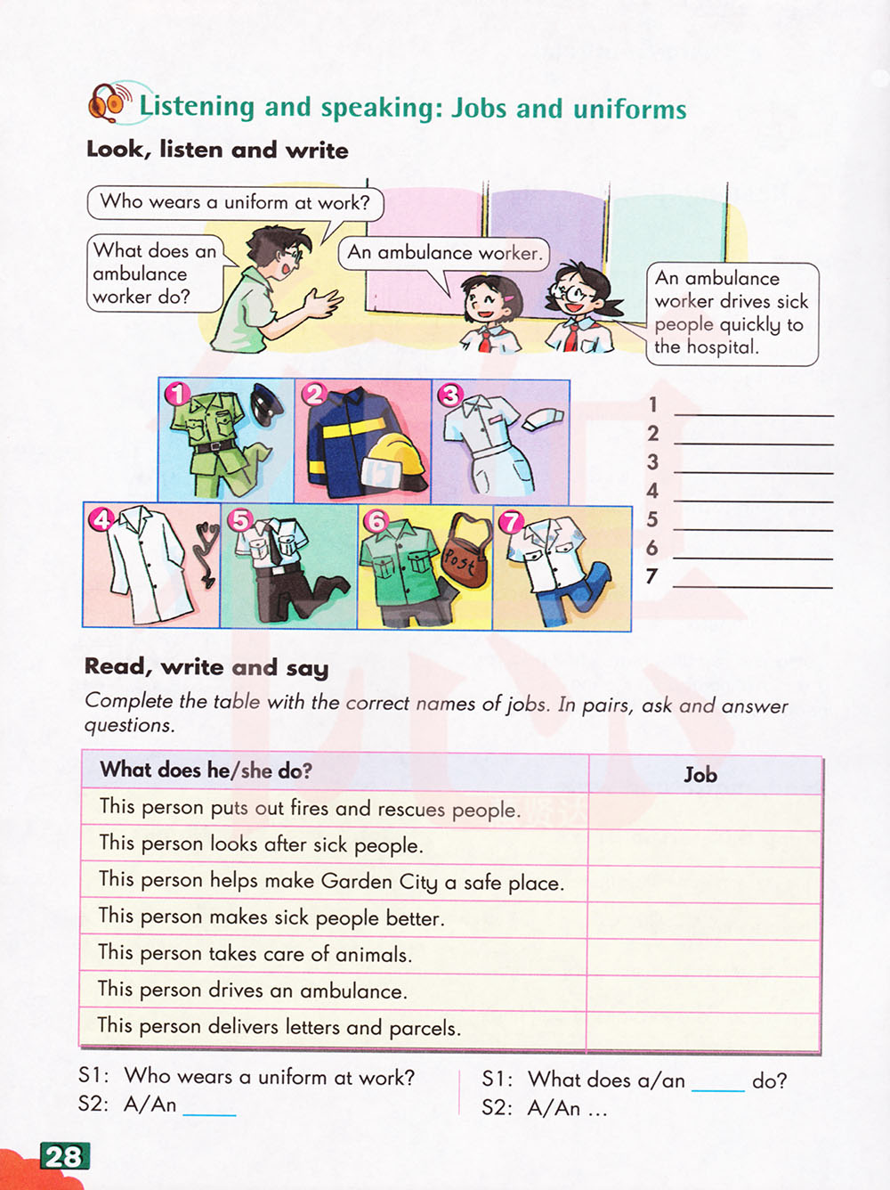 用正确的工作名称完成表格,两人一组,提问并回答问题。