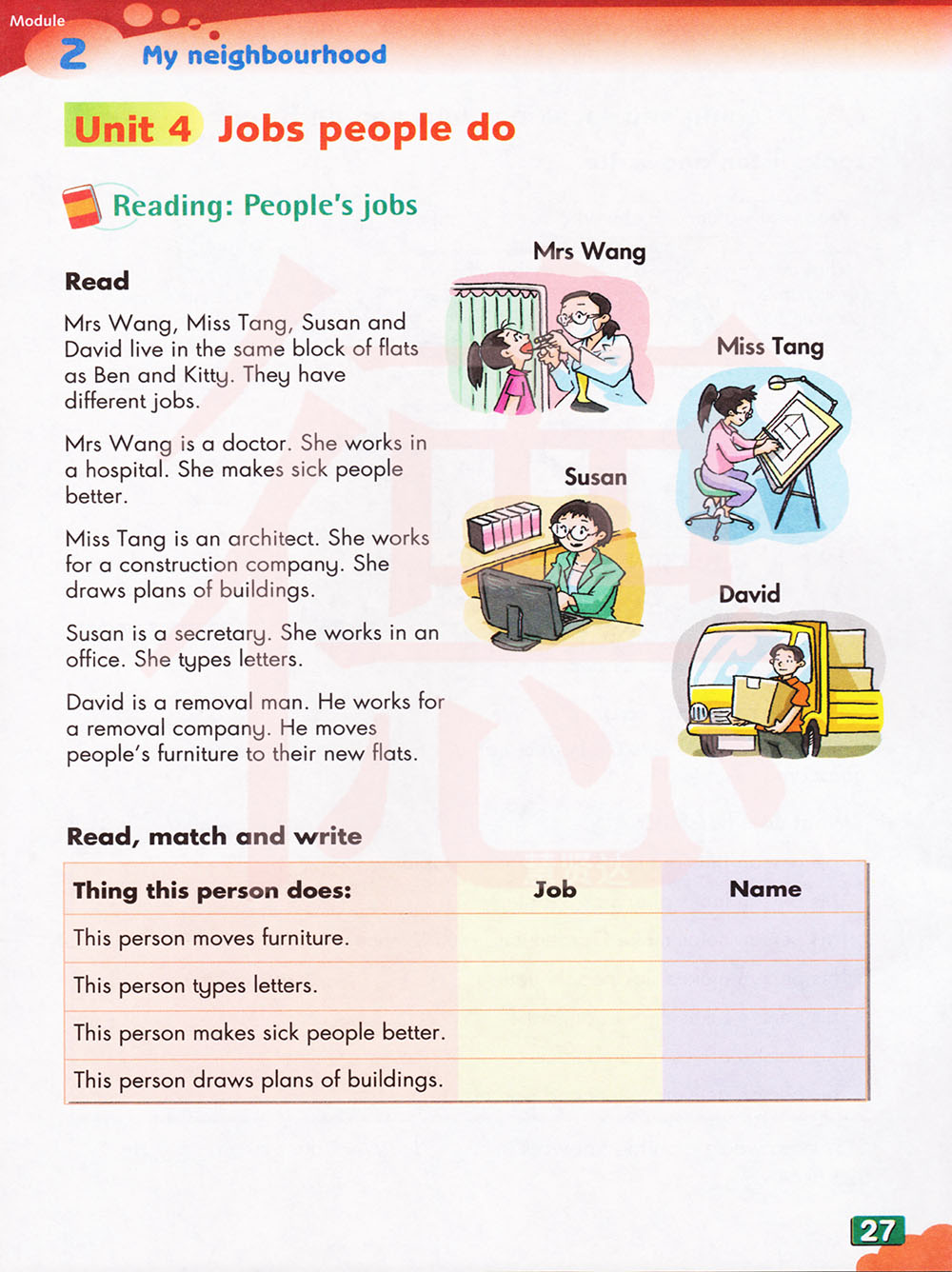 王太太、唐小姐、苏珊和大卫与本和凯蒂住在同一幢公寓里。他们有不同的工作。