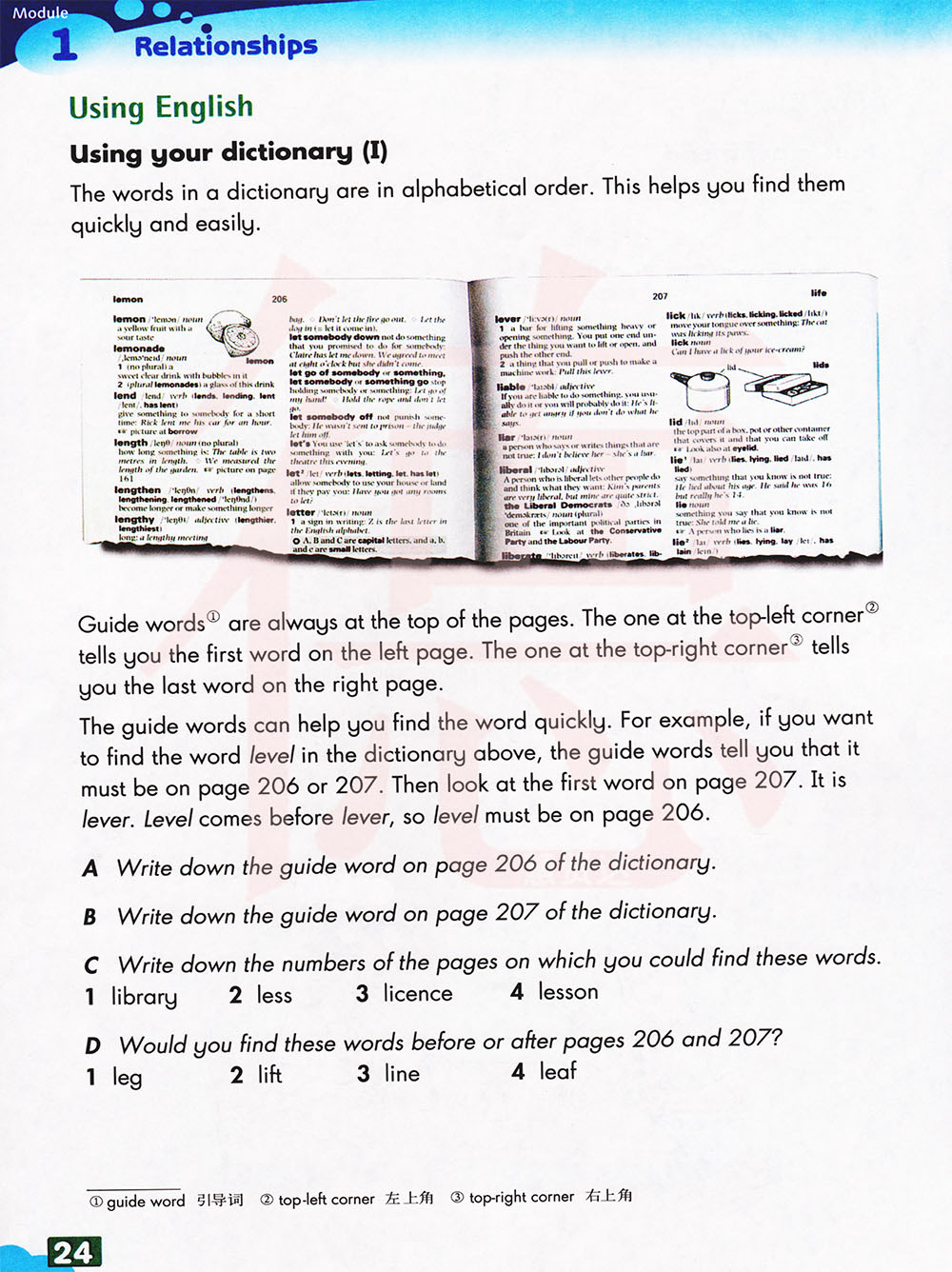 引导词可以帮助你快速找到单词。例如,如果你想要在上面的字典中找到单词级别,指导词告诉你必须在206或207页,然后看207页的第一个单词。这是杠杆。水平在杠杆之前,所以水平必须在206页。