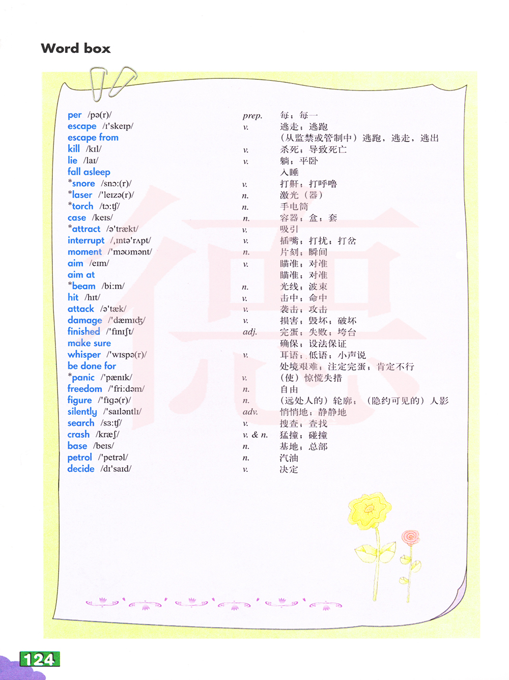 确保;设法保证 耳语;低语;小声说 处境艰难;注定完蛋;肯定不行 (使)惊慌失措 自由