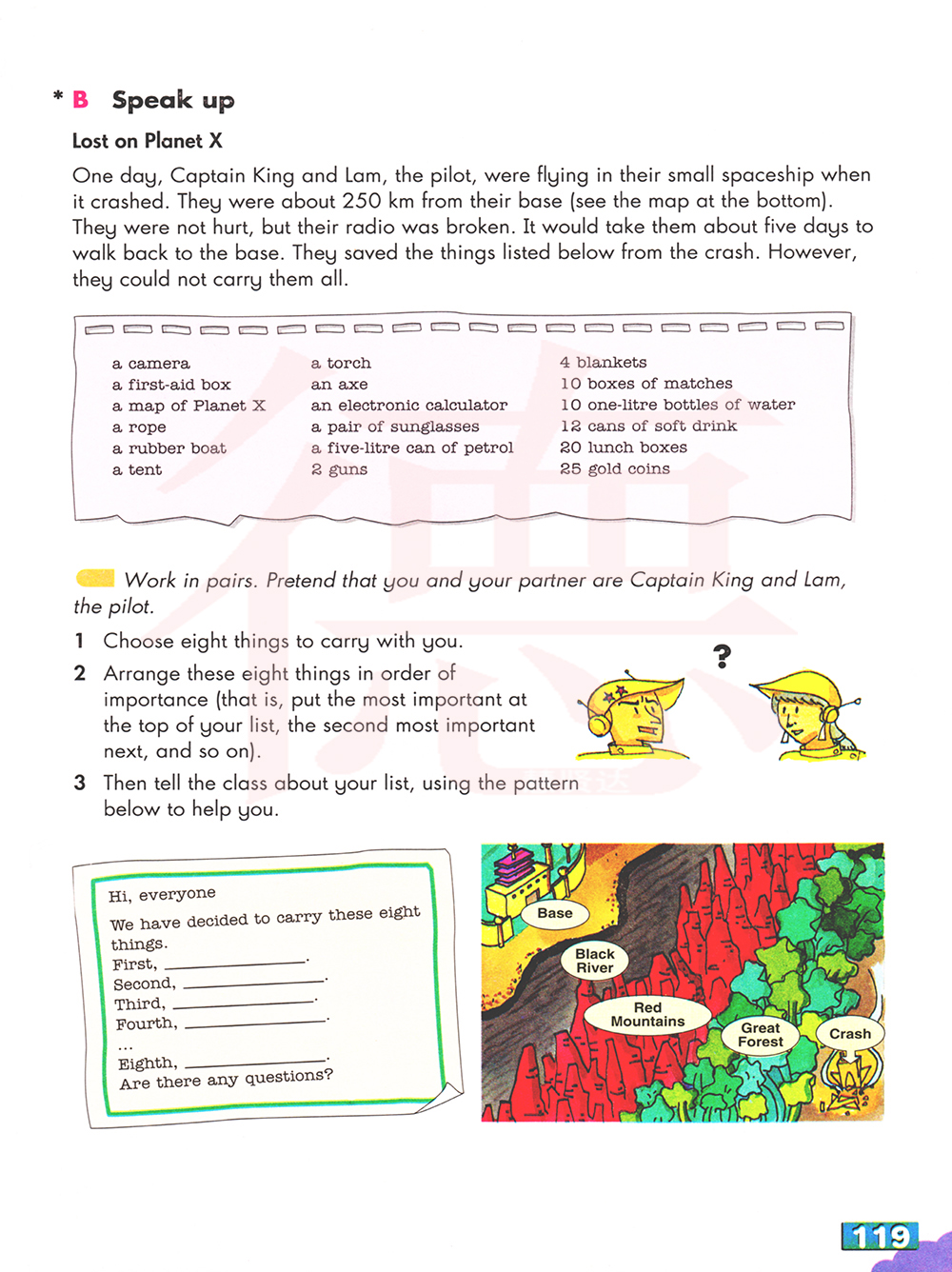 有一天,国王上尉和拉姆,飞行员,在他们的小宇宙飞船飞行时。它坠毁了他们离基地大约250公里(见底部的地图)。他们没有受伤。但他们的收音机坏了这将需要他们大约五天走回基地。他们从崩溃中保存了下面列出的东西。然而。他们不能携带他们所有。