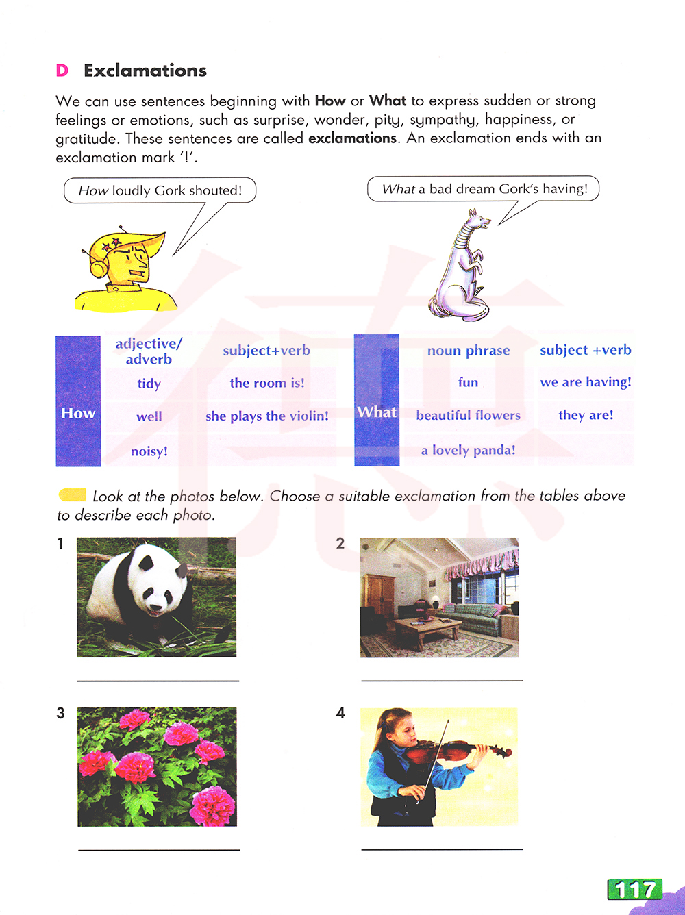 看看下面的照片。从上面的表格中选择合适的感叹号来描述每张照片。