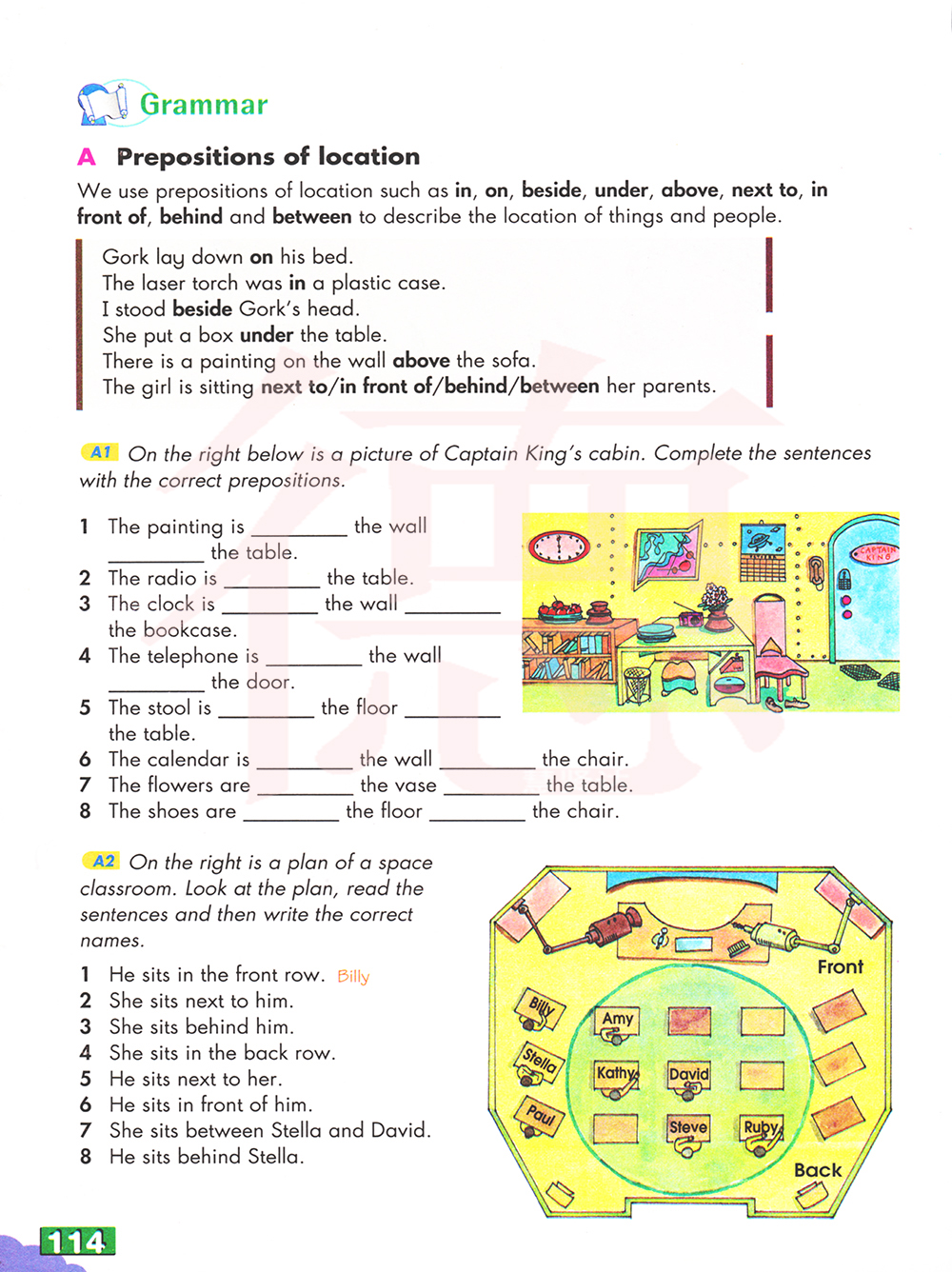 A2右边是一个空间的计划课堂。看计划,读句子,然后写正确的名字。