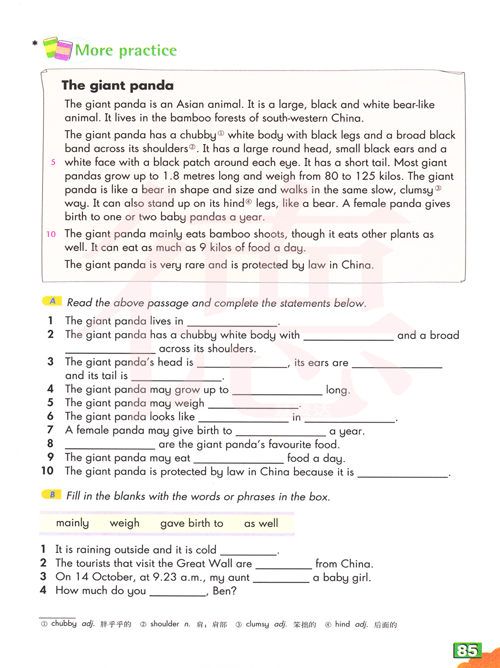 大熊猫有一个胖胖的白色身体,黑色的腿和宽大的黑色带在肩上*它有一个大圆头,小黑耳朵和白脸,每只眼睛周围都有黑色斑块。它有一个短的尾巴。最巨人熊猫长到1.8米长,体重从80公斤到125公斤不等。巨人熊猫就像一只熊在形状和大小,走在相同的缓慢,笨拙的。它也可以像熊一样站立在后腿上。雌性熊猫给每年产一两只大熊猫。