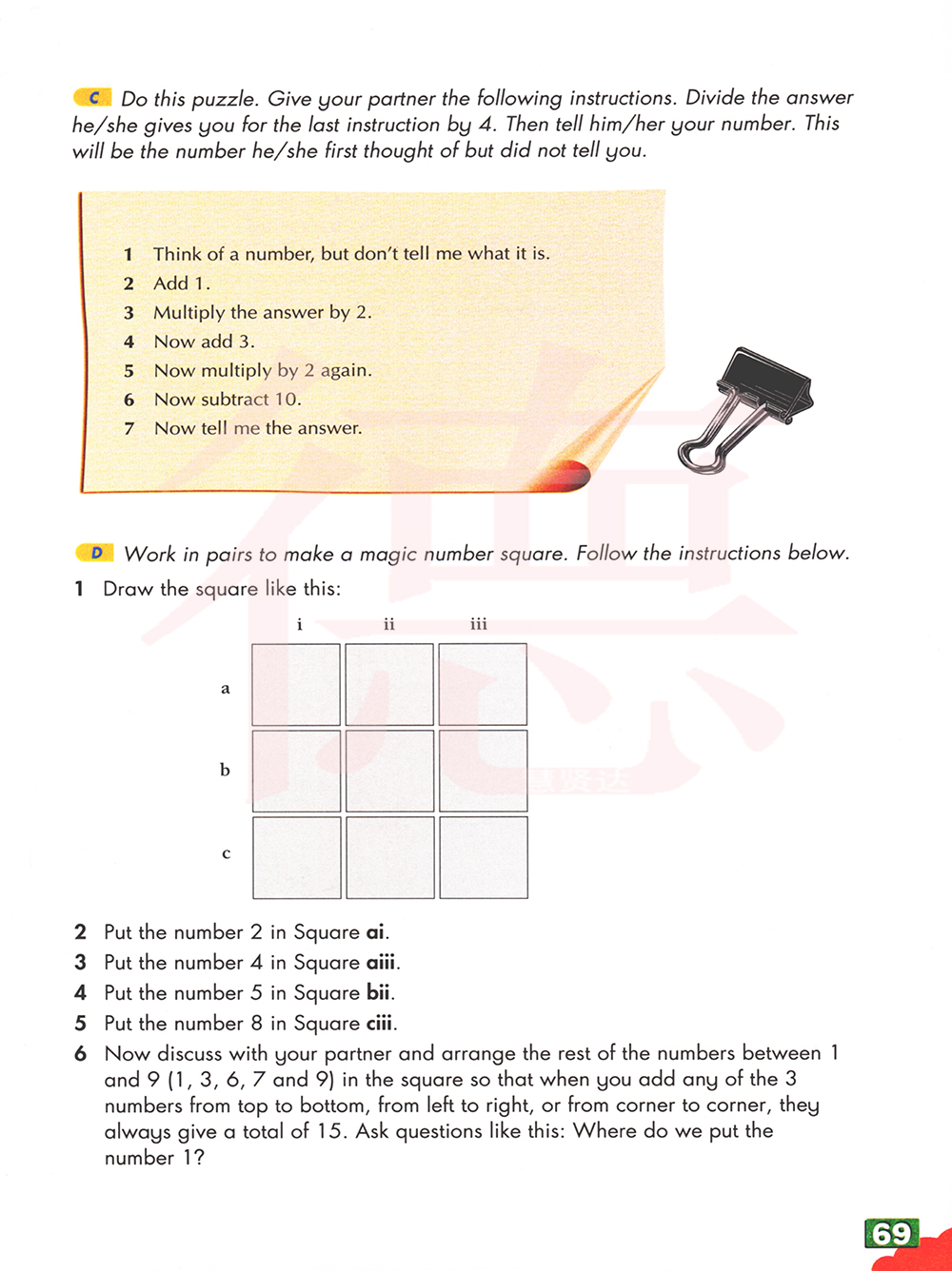 6现在与你的伴侣讨论和安排剩下的1 5 把8号之间的平方cii 1 把5号广场bii和9(1 3 6 7和9)在广场上,这样当你添加任何的3个数字从上到下,从左到右,或者从角落到角落里,他们只是给总共15.问这样的问题:1放在哪里