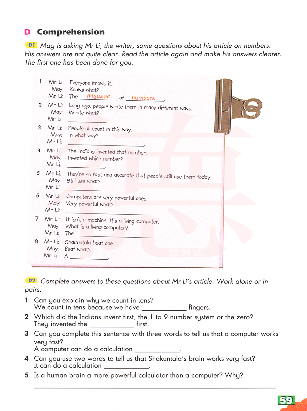 D1梅正在就他那篇关于数字的文章向作者李先生提出一些问题。他的答案不太清楚。再读一篇文章,使他的答案更清楚。第一个已经为你做好了。