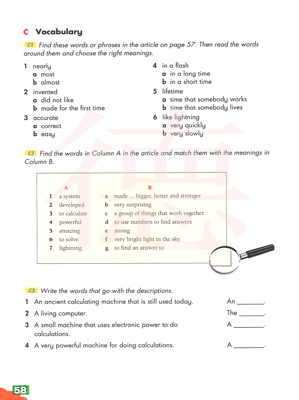 C1在第57页的文章中找到这些单词或短语。然后阅读周围的单词并选择正确的意思
