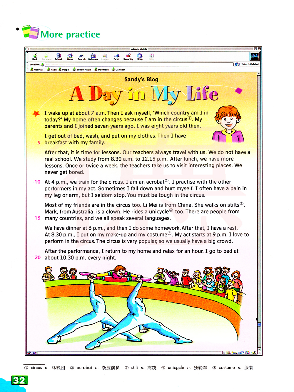 我们大多数朋友也在马戏团。李梅来自中国。来自澳大利亚的马克是个小丑。他也在骑独轮车。有来自15个国家的人,我们都说几种语言。