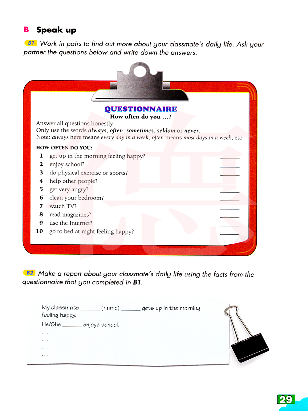 B2用在B1中完成的问卷中的事实,报告你同学的日常生活。