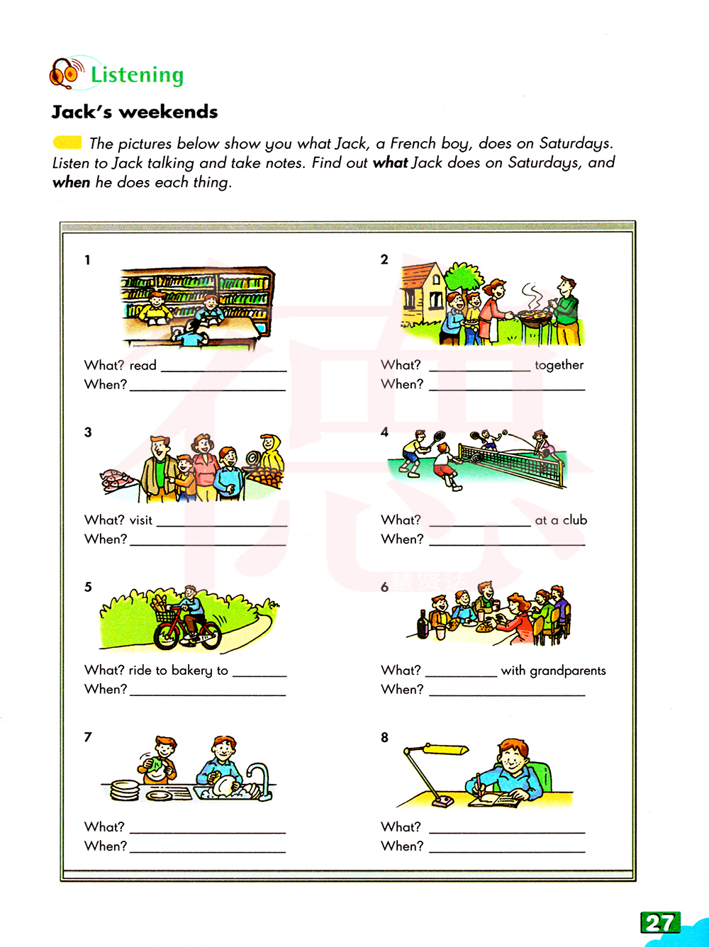 下面的图片向你展示了杰克,一个法国男孩,在星期六做什么听杰克说话和做笔记。找出杰克星期六做什么,以及他什么时候做每件事