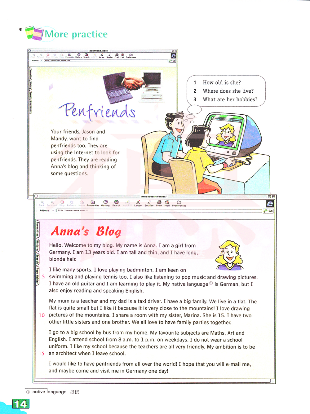 笔友 你的朋友杰森和曼迪也想和你交笔友。他们正在利用互联网寻找笔友。他们正在阅读安娜的博客并思考一些问题。