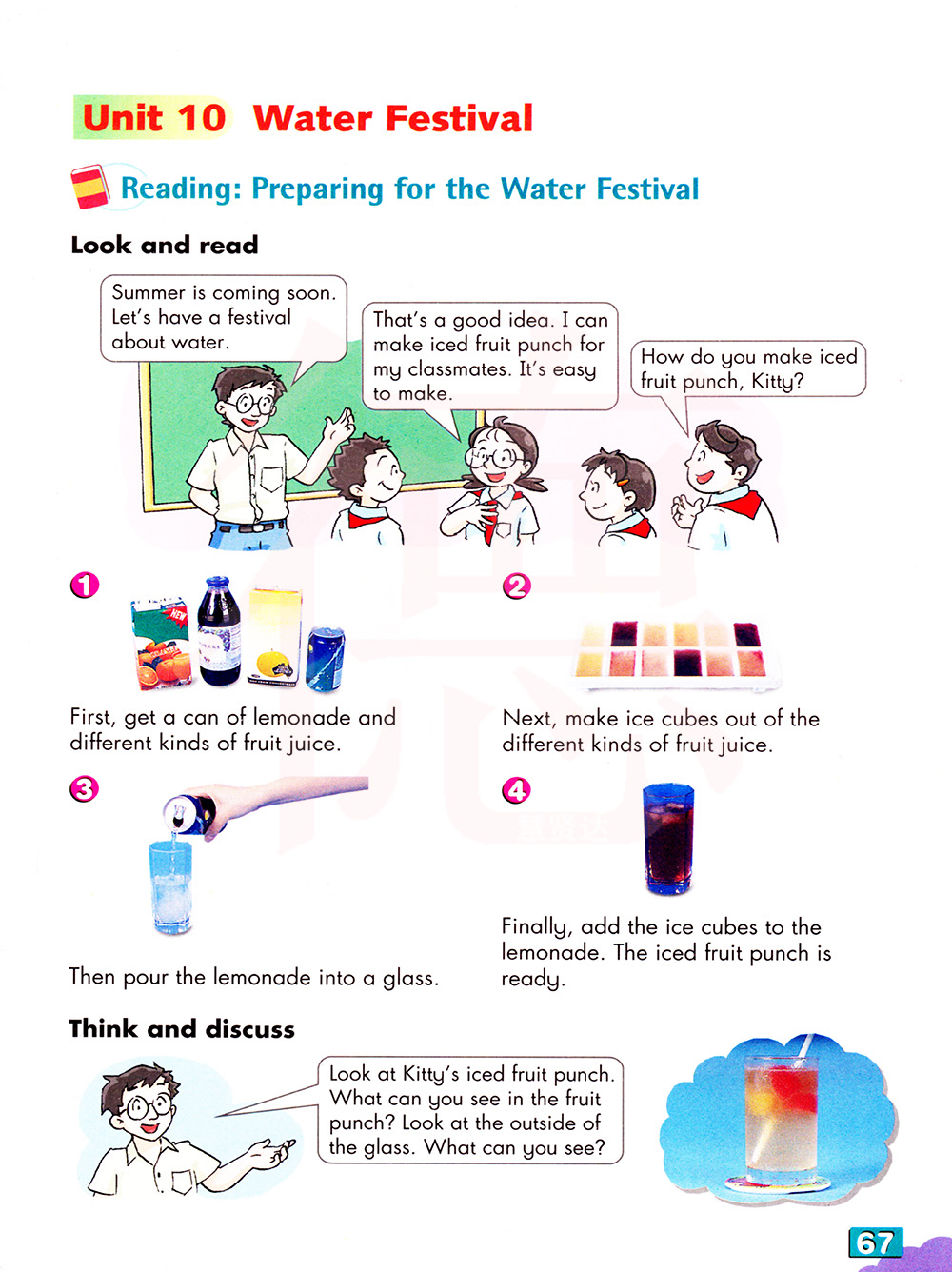 看凯蒂的冰镇水果潘趣酒。你能从果汁饮料中看到什么?看看玻璃的外面,你能看到什么?