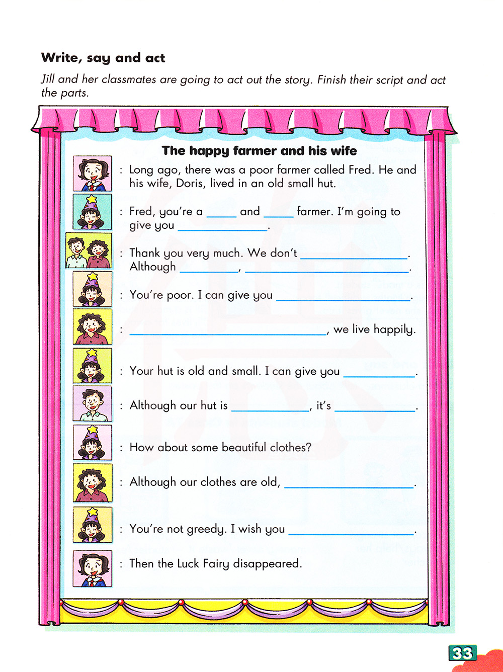 吉尔和她的同学们将要表演这个故事。完成他们的剧本,并把这些部分写下来。