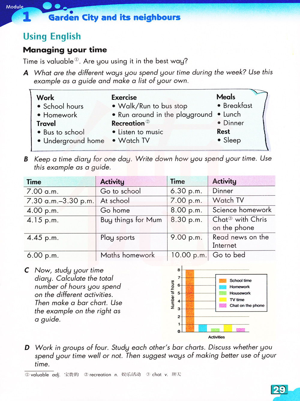 四人一组,研究彼此的柱状图。讨论你是否把时间花的很好。然后提出更好的利用时间的方法。