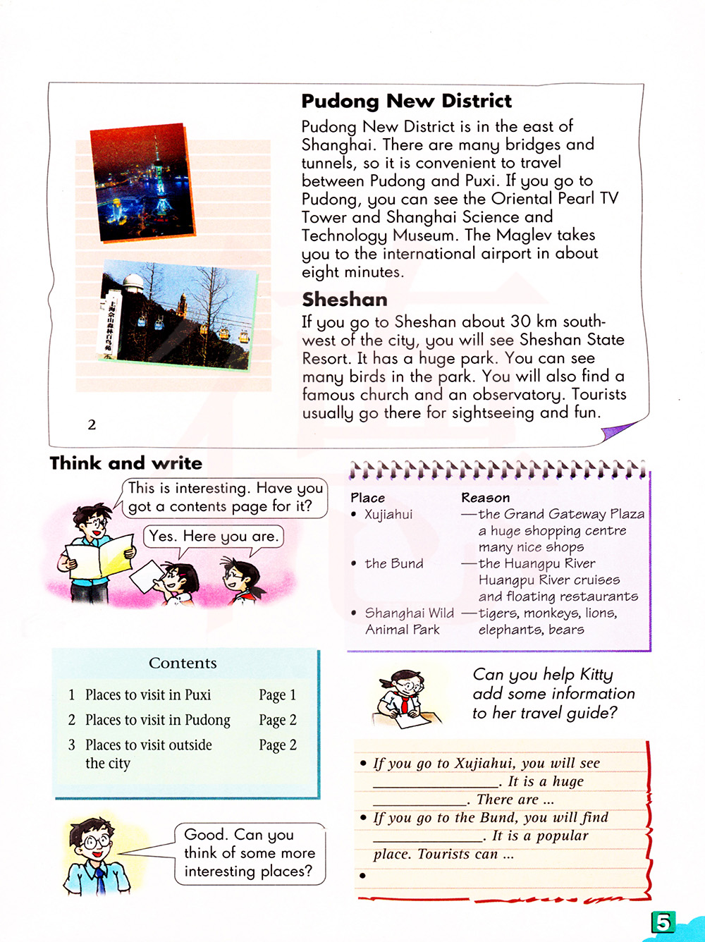 浦东新区位于上海的东部。浦东和浦西之间有许多桥梁和隧道,交通十分便利。如果你去浦东,你可以看到东方明珠电视塔和上海科技馆。磁悬浮列车大约8分钟就能把你送到国际机场。