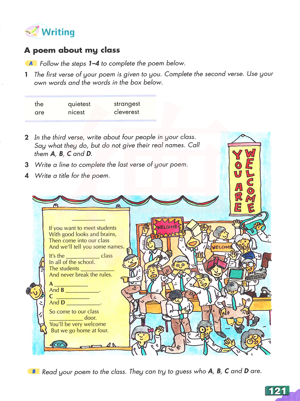 B给全班读你的诗。他们可以猜测谁A,B、C 和 D 。