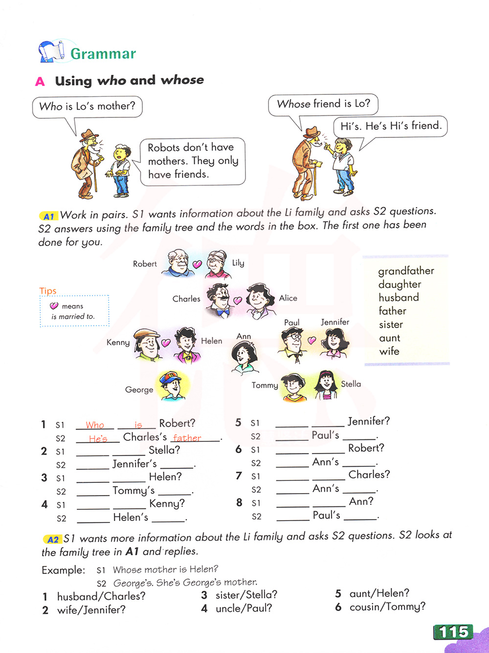 A2成对工作。S1想了解李家的信息,并问了S2问题。使用家庭和框中的单词进行 S2 答案。第一个是为你做的。