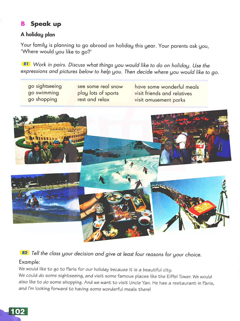B1成对工作。讨论你在假期想做的事情。使用表达和图片,以帮助您。然后决定你想去哪里。