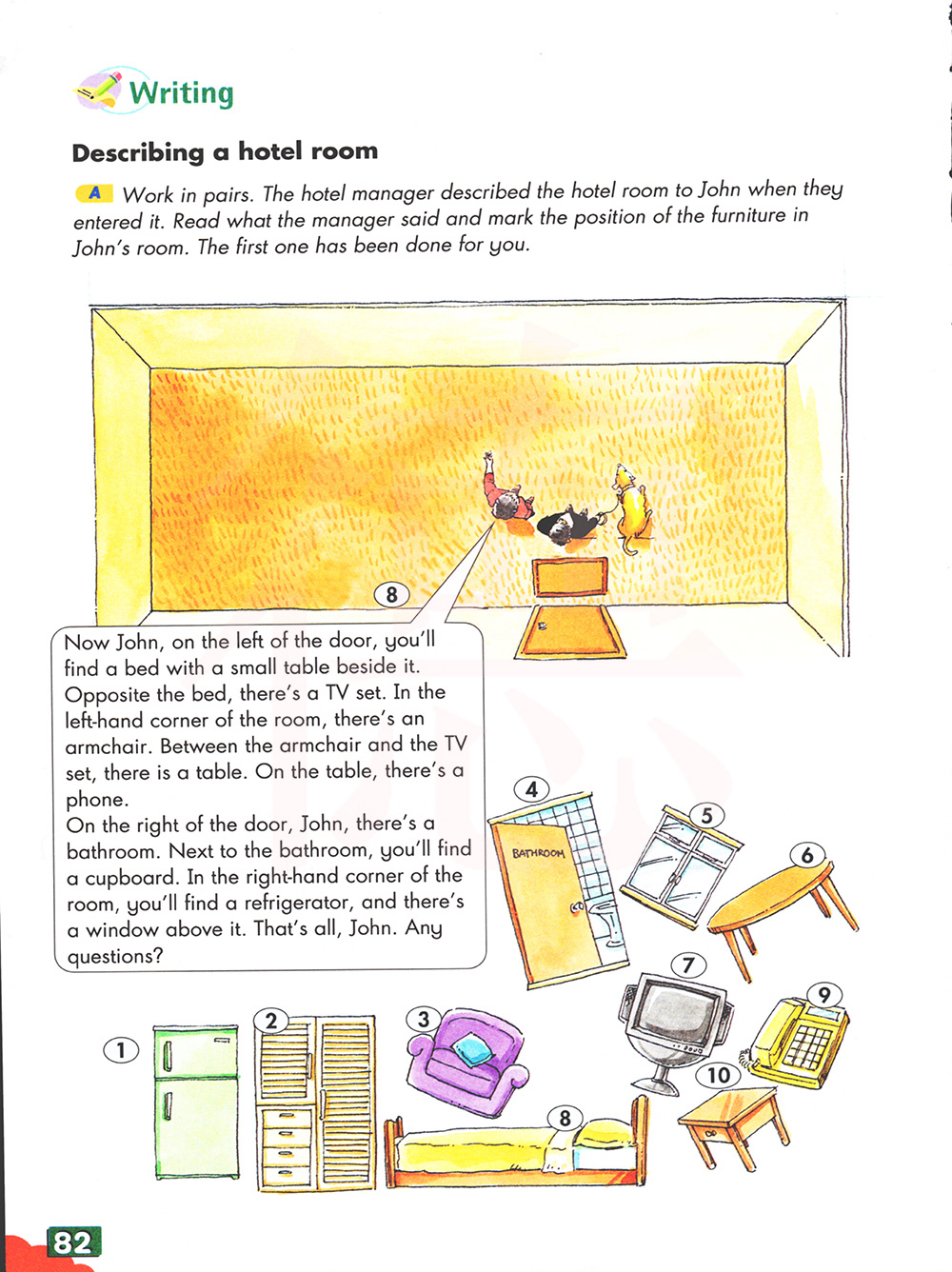 A成对工作。酒店经理向约翰描述了旅馆房间,当时他们进入了。阅读经理所说的话,并标记家具的位置 约翰的房间第一个已经为你做了。