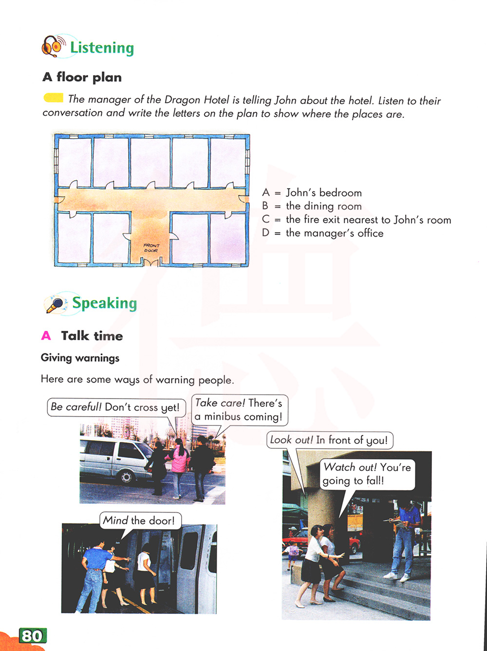 饭店的经理正在告诉约翰旅馆的事。听听他们的对话,在计划上写信,以显示地方在哪里。