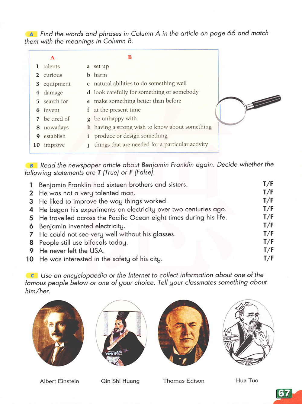 B再读一遍关于本杰明·富兰克林的报纸文章。判断以下语句为 T(正确)或 F(错误)。