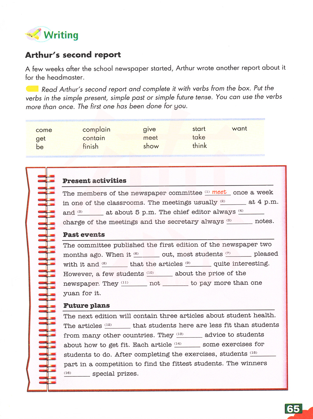 阅读亚瑟的第二份报告,用方框中的动词完成。把动词放在一般现在时,一般过去时或一般将来时。您可以不止一次使用动词。第一个已经为你做了。