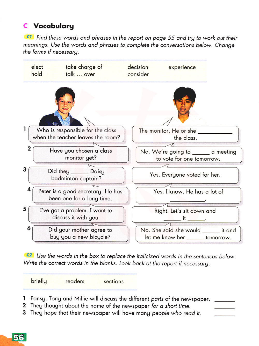 1潘西、童和米莉将讨论报纸的不同部分。 2他们想了一会儿报纸的名字。