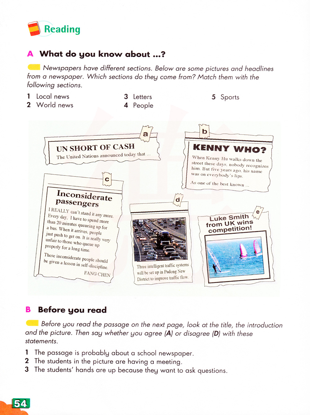 报纸有不同的版面。下面 是报纸上的一些图片和标题。它们来自哪个部分?将它们与以下部分匹配。