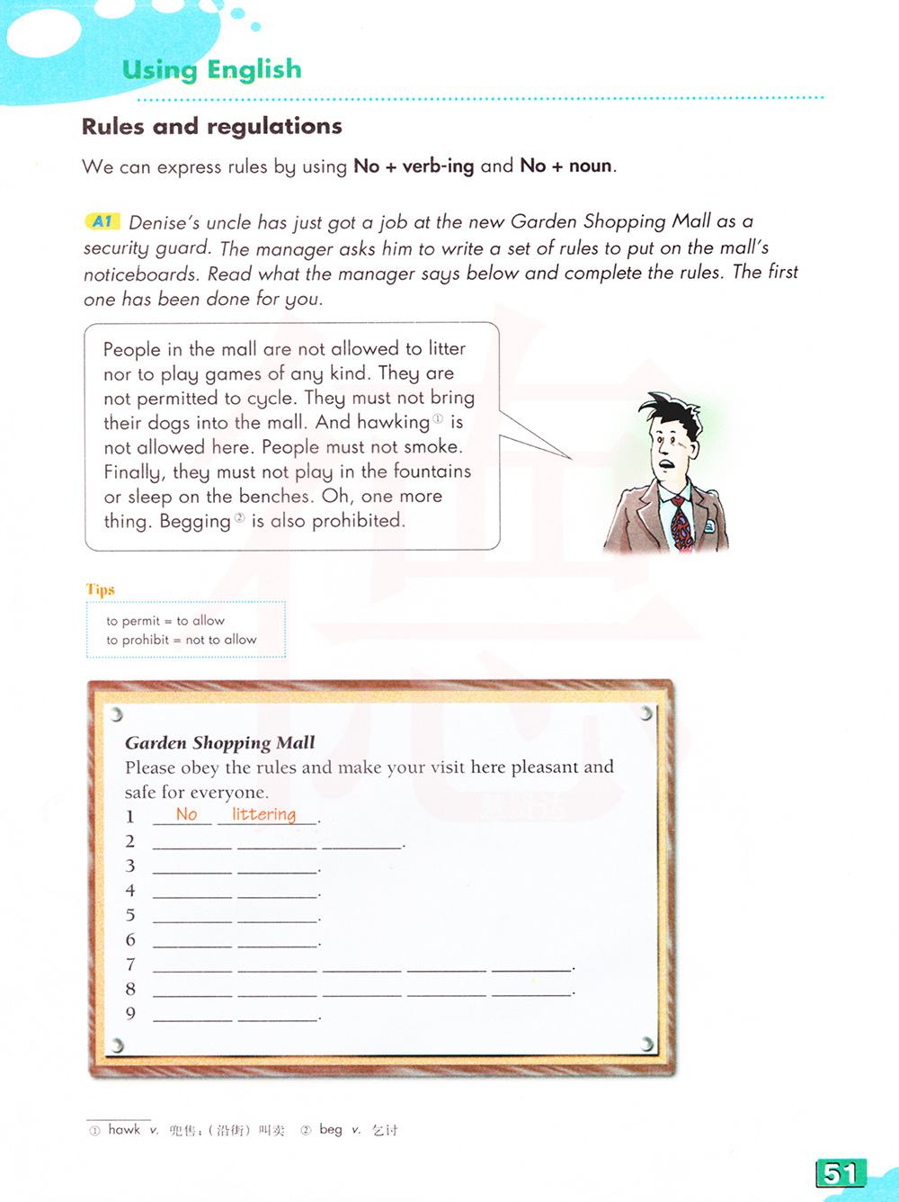 A1丹尼斯的叔叔刚刚在花园购物中心找到一份作为保安的工作。经理请他写一套规则在商场的公告牌上。阅读经理在下面所说的内容,并完成规则。第一个已经为你做了。