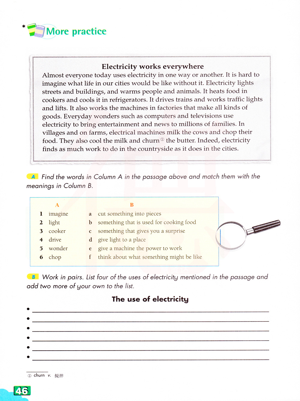 B成对工作。列出四个在文章中提到的电力的使用和在列表中再添加两个您自己的。
