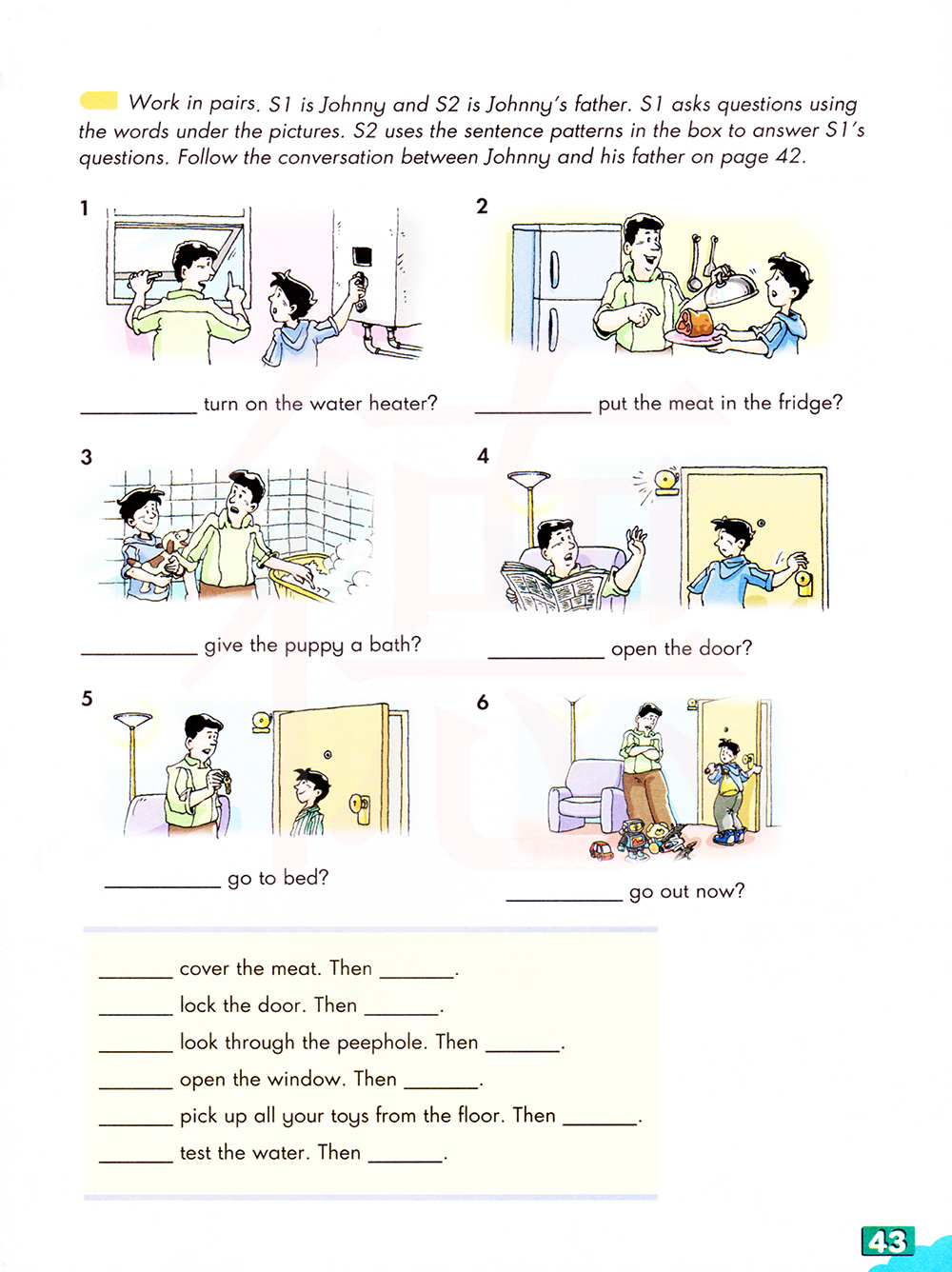 成对工作。S是约翰尼,S2是约翰尼的父亲。Sl 使用图片下的文字。S2 使用框中的句子模式来表示 S1的问题。关注约翰尼和他父亲在第42页的谈话。