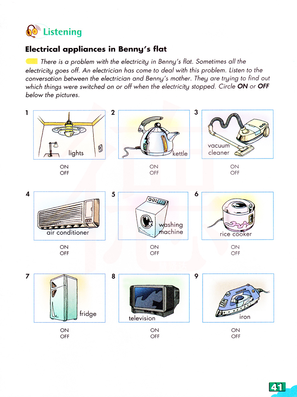 本尼公寓的电有问题。有时所有的电都断了。一位电工来处理这个问题。听电工和本尼的母亲之间的谈话。他们试图找出停电时,哪些东西被打开或关闭。在图片下方圈上或圈下。