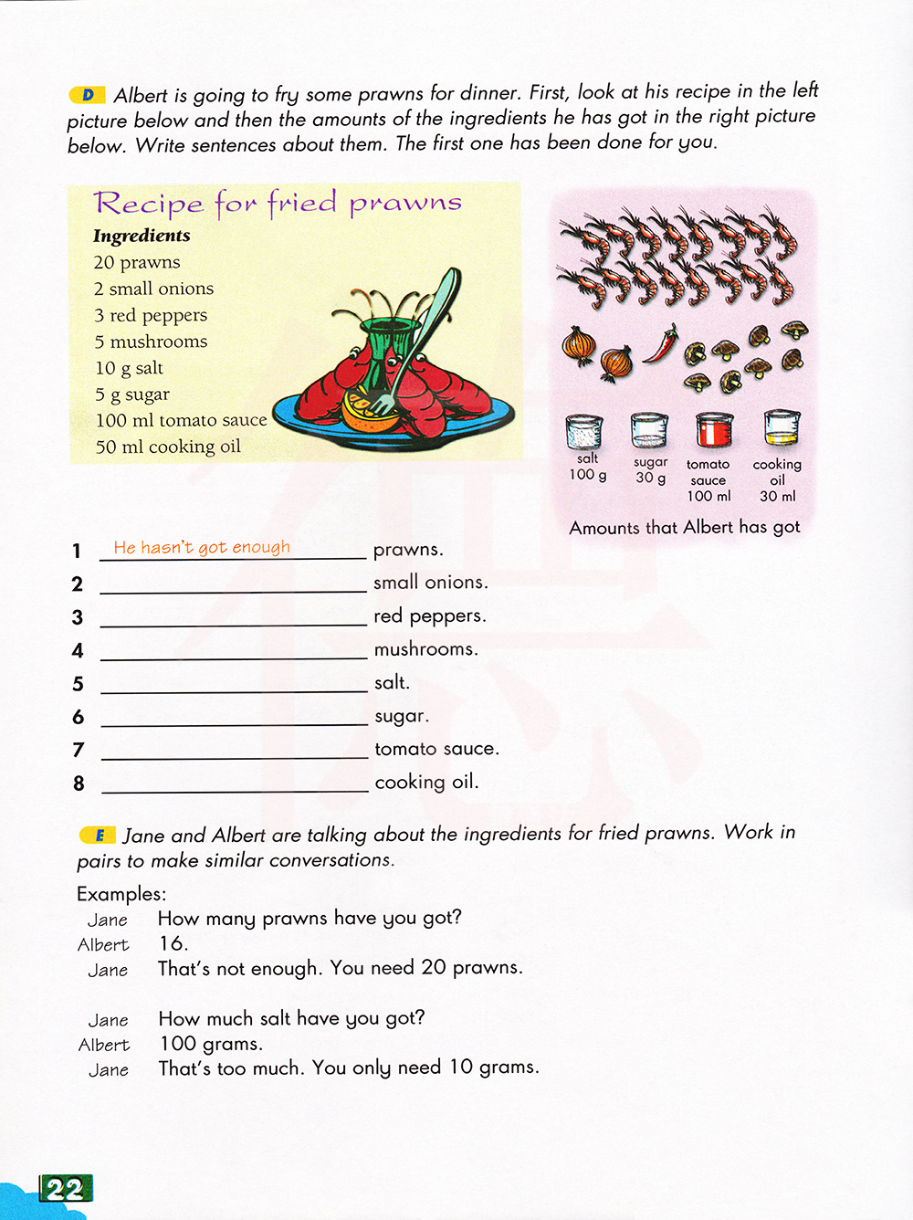 艾伯特打算在晚餐时炸一些虾。首先,看看他左边的食谱,然后数量在右图得到不少配料。写关于他们的句子。第一个已经为你做了