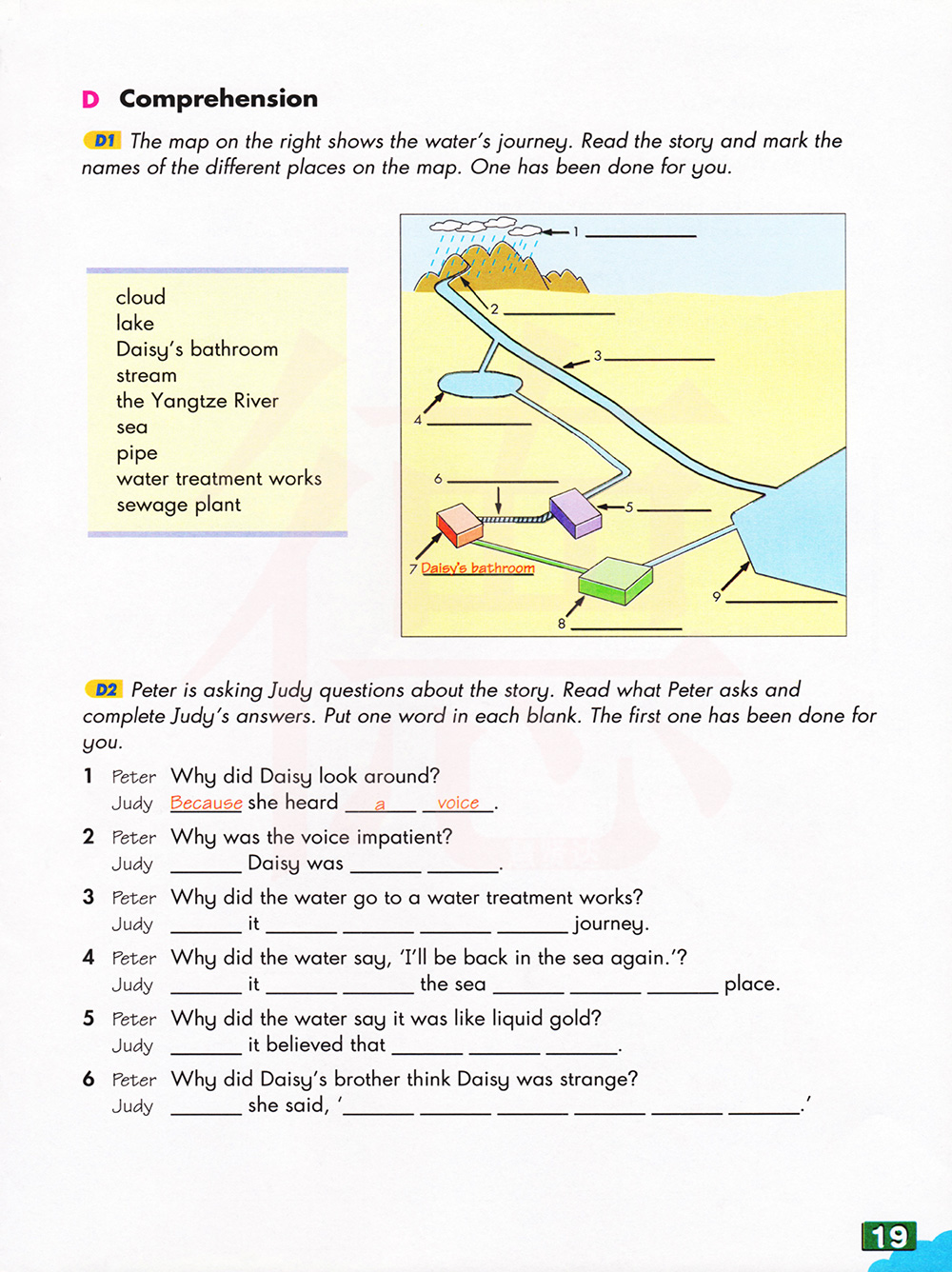 D1右边的地图显示了水的流程。阅读故事并在地图上标出不同地方的名字,一个已经为你做了。
