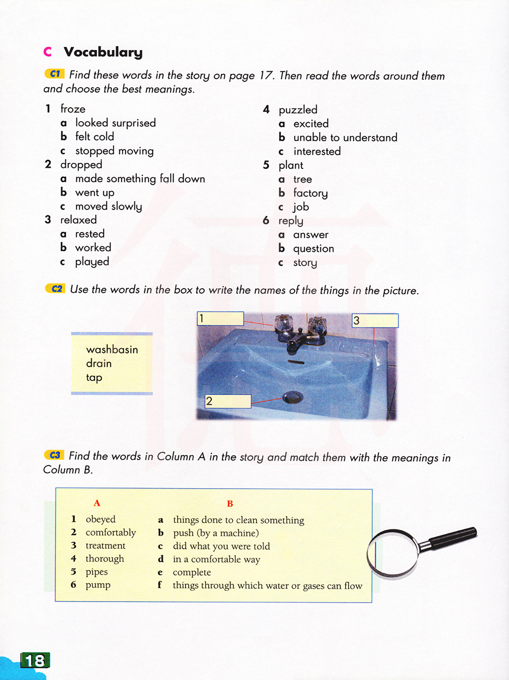 在第17页上的故事中找到这些词。然后读了他们周围的单词,选择最好的意思。