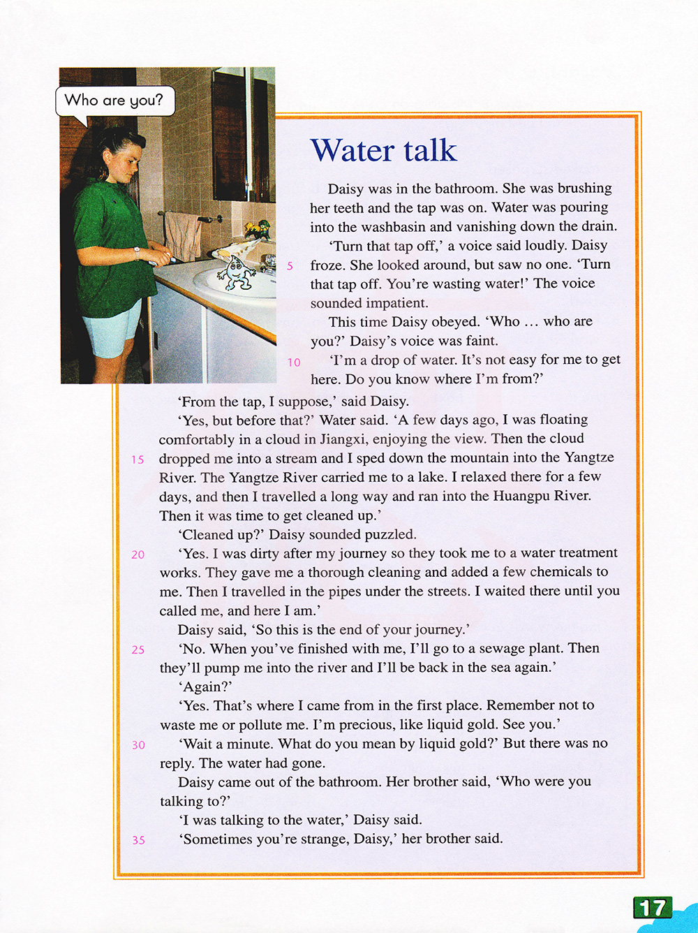 "我在跟水说话,"黛西说。 "有时候你很奇怪,黛西,"她哥哥说。
