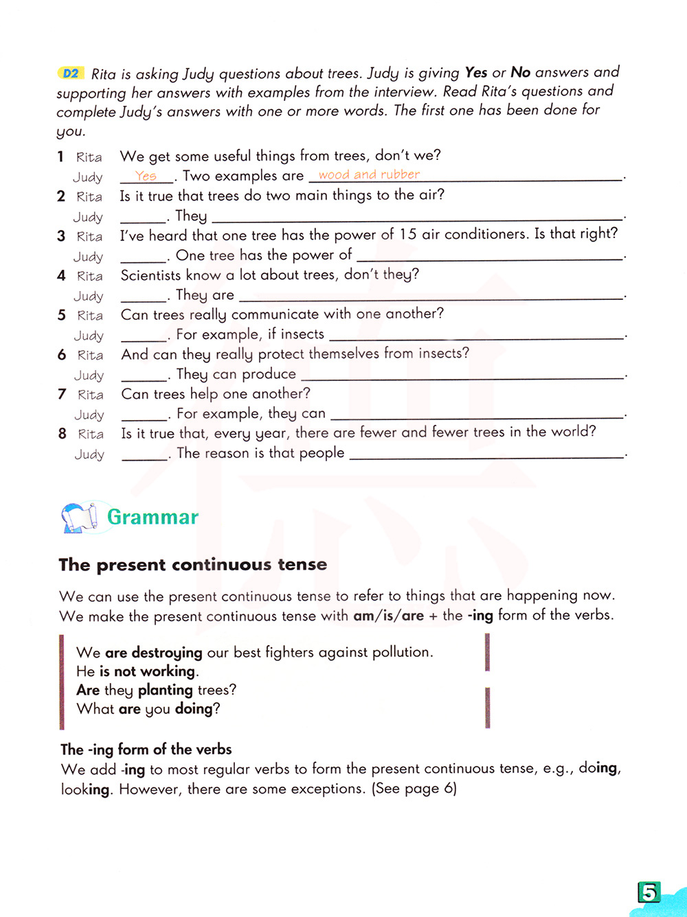 丽塔正在问朱迪关于树木的问题。Judy给出是或否的答案,支持她的答案与从采访的例子,阅读丽塔的问题和用一个或Judy的词来回答朱迪。第一个已经为你做好了。