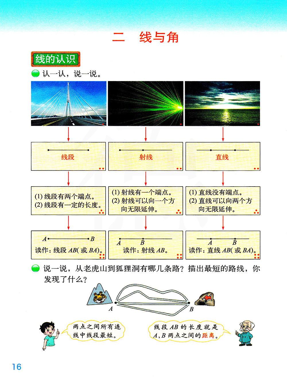 线段有两个端点不可以向两端延长 射线、线段都是直线的一部分,射线一端延长可以得到一条直线,线段一端延长可以得到一条射线,,两端延长可以得到一条直线
