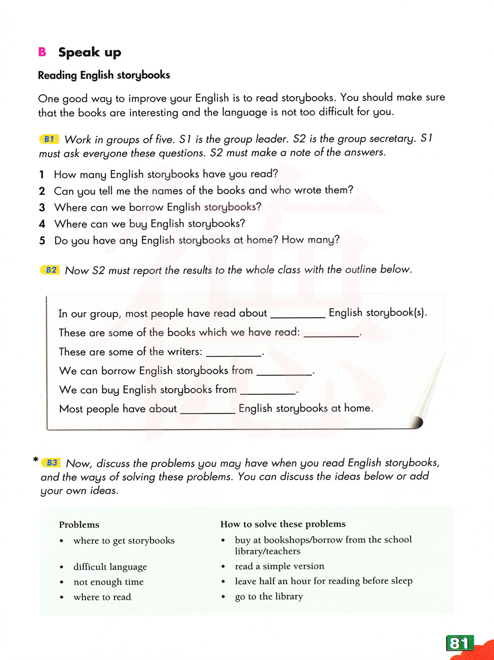 现在,讨论一下你读英语故事书时可能遇到的问题和解决这些问题的方法。你可以讨论以下想法或添加自己的想法。