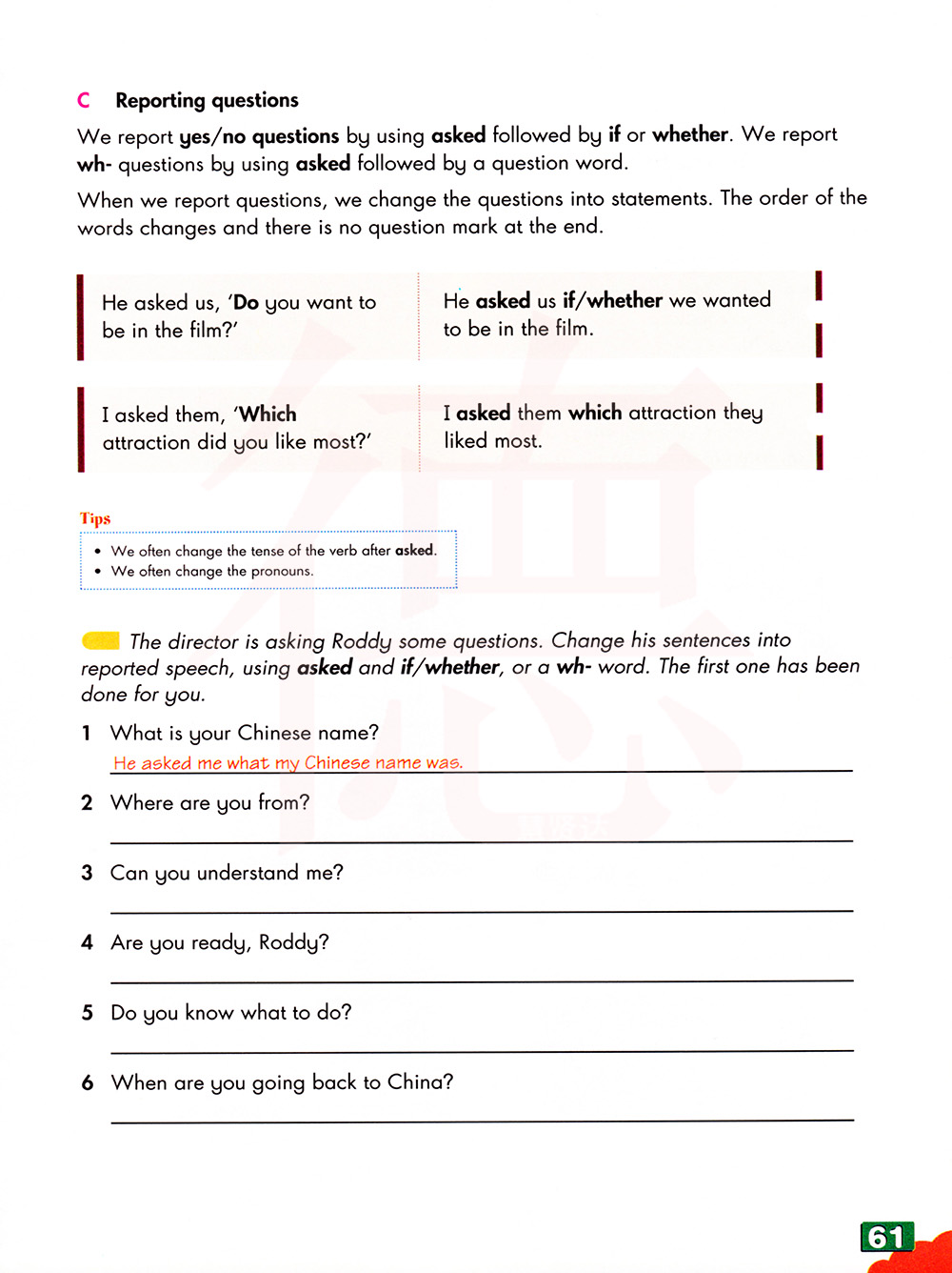 报告是/否问题,使用询问后,如果或是否。我们报告使用提问后跟一个问题词的问题。